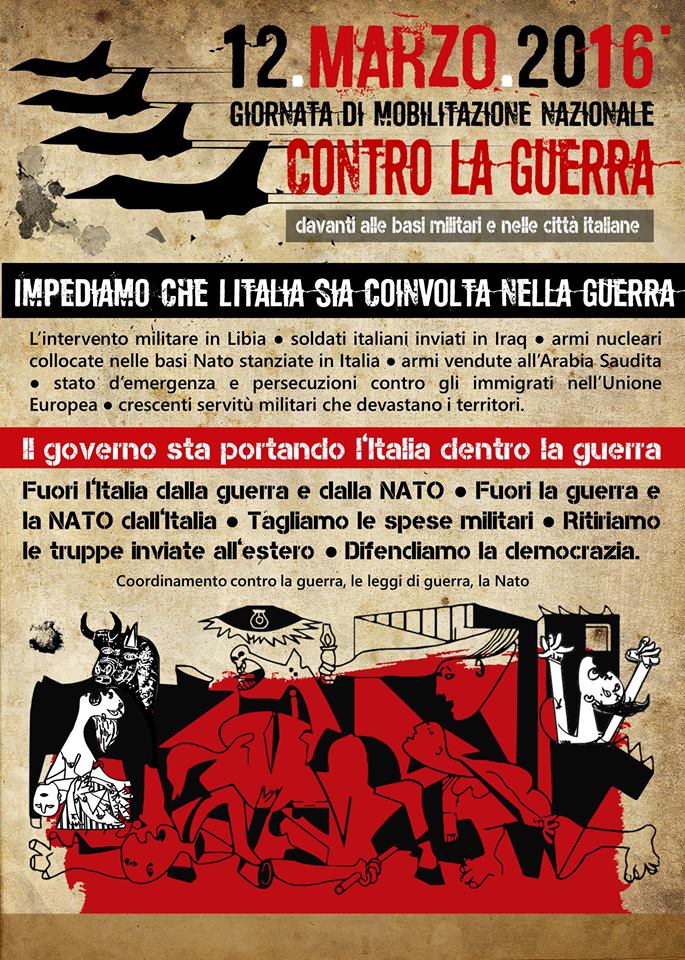 L’intervento militare in Libia ormai alle porte; soldati italiani inviati in Iraq; armi nucleari collocate nelle basi Nato stanziate in Italia; armi vendute all’Arabia Saudita; stato d’emergenza e persecuzioni contro gli immigrati nell’Unione Europea; crescenti servitù militari che devastano i territori